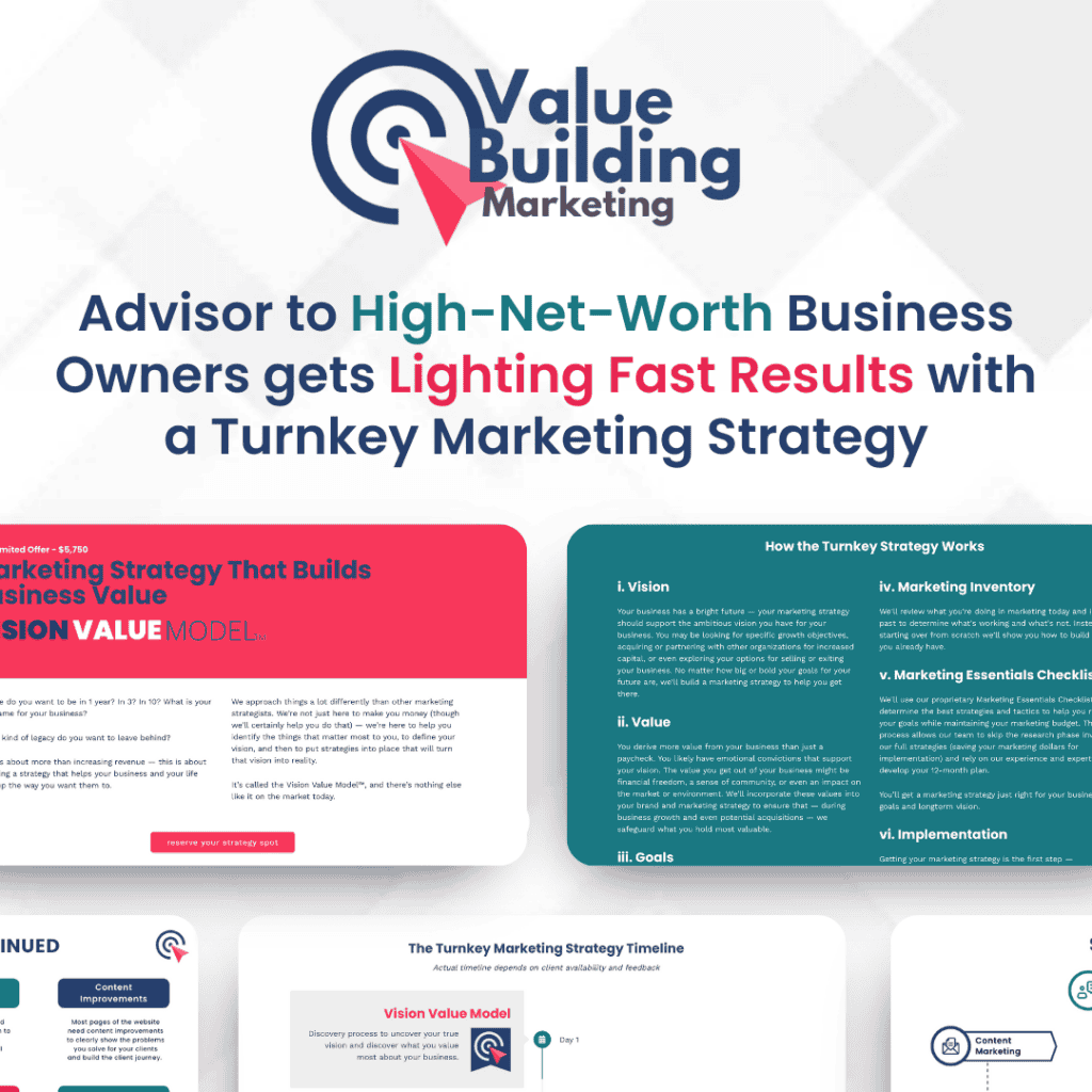 Marketing Resources Articles 6 Indisputable Reasons In-Person Networking > Virtual Read More → The Dynamic Duo of Value Building Marketing: Heather and Randi, Your Next Event’s Game-Changers Read More → Strategy Refresh—Optimizing our Medical Client’s Marketing Strategy Read More → Business Dashboards—Your Key to Impactful, Efficient Marketing Read More → Advisor to High-Net-Worth Business Owners gets Lighting Fast Results with a Turnkey Marketing Strategy Read More → Repeatable Success — Building the Business Transitions Summit Read More → Marketing Magic: Unleash Your Business’s Potential with Value Building Business Dashboards Read More → Jumpstart 2024 with a Powerful Marketing Strategy and KPI Dashboard Read More → Published, Not Perfect: Strategy + Process – Your Perfectionism = Awesome Read More → The Vision Value Modelâ„¢ — Revolutionize Your Business Read More → From 0 to 100 — Taking Their Vision and Making It Reality Read More → From Lack of Direction to a Clear Path — Creating a Marketing Foundation Read More → « Previous 1 2 3 4 5 6 Next » Get Started